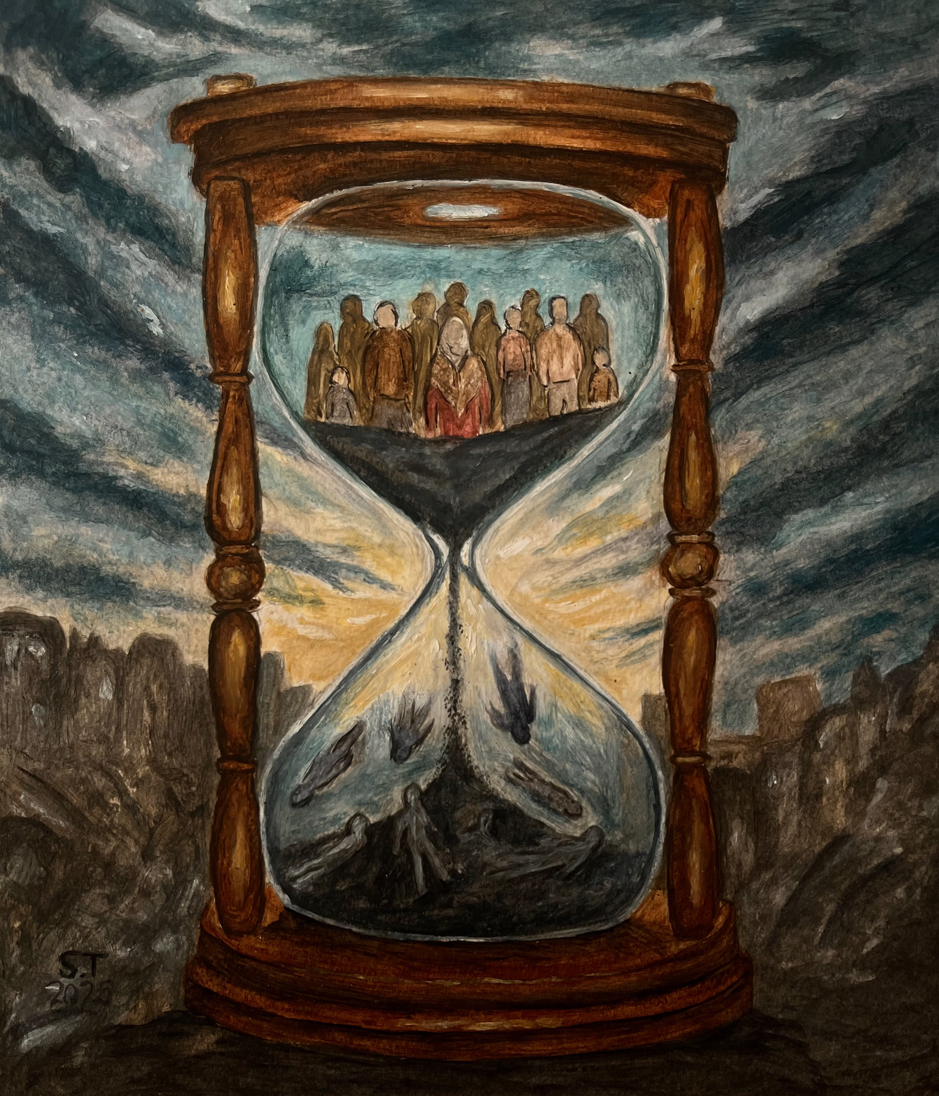 Inside the giant hourglass, humanity waits in trembling stillness.