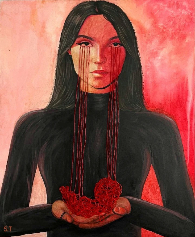 This painting reflects the silent pain that goes unheard—the tragedy of unborn children who were killed in their mothers’ wombs during the war in Gaza. Before they could see the light, before their hearts fully learned to beat, their lives were taken. The dominant red in the artwork symbolizes the overwhelming amount of bloodshed, as if life itself was cut short before it even began. This is not just a painting—it is a cry from the womb of life. It tells the story of children who never had names, who never had voices, yet were there… silent witnesses to the cruelty of war.